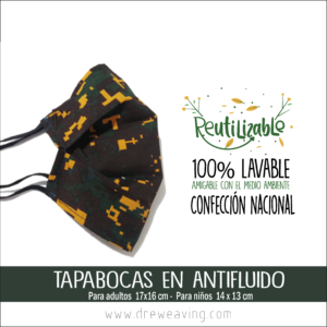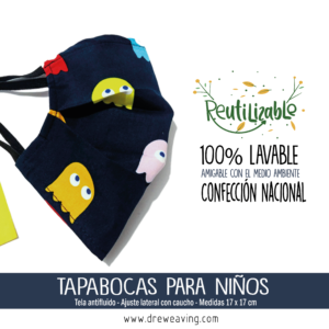 Tapabocas en tela antifluido, 100% lavable, estampado colorido y divertido con caucho plano en los extremos laterales.